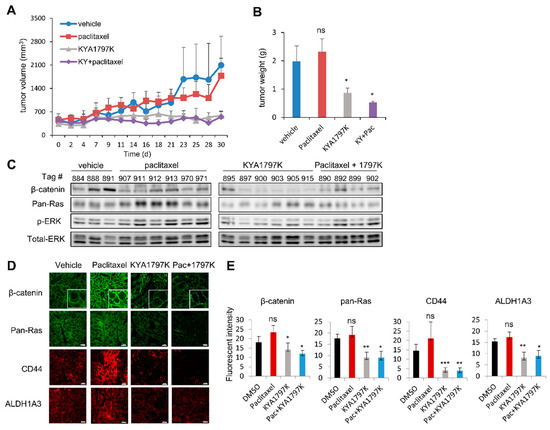 The growth of xenografted tumors was not affected by treatment with paclitaxel, but was suppressed by treatment with KYA1797K alone or in combination with paclitaxel (Figure 5A). Both the weight and size of the tumors were significantly reduced with treatment of KYA179K; however, they were not significantly affected by treatment with paclitaxel (Figure 5B and Figure S7). Both β-catenin and pan-Ras were significantly reduced upon treatment with KYA1797K, although they mostly remained high or were even increased by treatment of paclitaxel (Figure 5C–E). Similar effects of KYA1797K on the specificities in the suppression of the expression of β-catenin and pan-RAS as well as CD44 and ALDH1A3 were confirmed by IHC analyses of the PDX tumor tissues (Figure 5C,E).