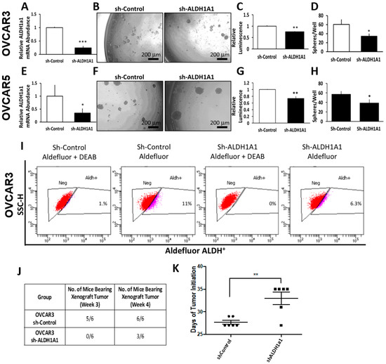 Effects of ALDH1A1 knock down on stemness phenotype. (A) OVCAR3 cells were transfected with nontargeting shRNA (Sh-Control) or shRNA targeting ALDH1A1 (sh-ALDH1A1), and ALDH1A1 knockdown was verified by qRT-PCR. (B,D) Sphere formation in OVCAR3 cells stably transfected with sh-Control and sh-ALDH1A1 and plated under low attachment conditions for six days. Spheres were photographed (100× magnification, B); numbers of live cells were assessed by using the Cell-Titer Glo assay (C), and the numbers of sphere per well were counted (D). (E) OVCAR5 cells were transfected with sh-Control or sh-ALDH1A1 and assessed for ALDH1A1 knockdown by qRT-PCR analysis. (F–H) OVCAR5 cells were plated under low attachment conditions for six days; spheres were photographed (100× magnification, F); numbers of live cells were assessed by using the Cell-Titer Glo assay (G), and the numbers of sphere per well were counted (H). Bars represent averages of triplicate measurements; *** corresponds to p < 0.001; ** corresponds to p < 0.01; * corresponds to p < 0.05. (I) Percentage of ALDH+ cells in sh-Control or sh-ALDH1A1 transfected OVCAR3 cells. (J) OVCAR3 sh-Control and sh-ALDH1A1 were subcutaneously injected into the flanks of nude mice and tumor initiation was assessed; data captures the total number of tumors detectable at week #3 and at week #4. (K) Time to tumor initiation measured in days after subcutaneous injection of sh-Control and sh-ALDH1A1 transfected cells in the flanks of nude mice (n = 6 per group).