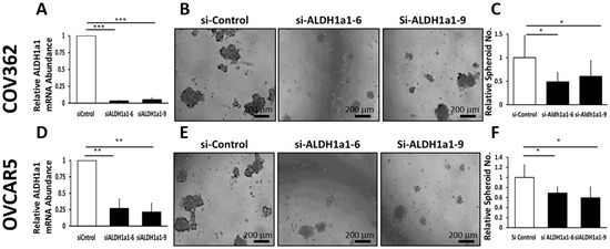 The effects of ALDH1A1 downregulation were further studied in other OC cells transiently transfected with ALDH1A1-targeting siRNAs. Transient transfection of siRNAs sequences targeting ALDH1A1 mediated effective down regulation of the enzyme in COV362 and OVCAR 5 cells (Figure 4A,D). ALDH1A1 knockdown significantly reduced spheroid formation under low attachment conditions in COV362 (Figure 4B,C) and in OVCAR5 cells (Figure 4D–F), as measured by microscopy and sphere counting, supporting the significance of this enzyme to spheroid proliferation.