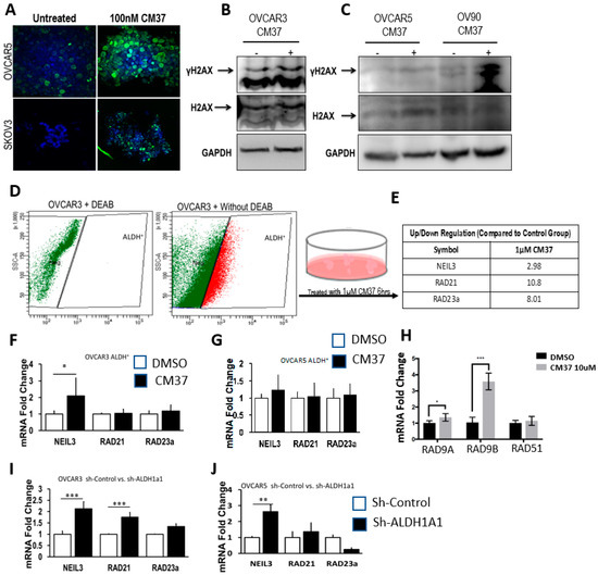 Several members of the aldehyde dehydrogenase family have been associated with cellular processes that minimize the impact of reactive oxygen species (ROS), which in turn are involved in oxidative stress-induced DNA damage. To elucidate the potential mechanism by which ALDH1A1 inhibition blocks cancer cell proliferation as spheres, we assessed whether CM37 induced DNA damage. CM37-treated OVCAR5 and SKOV3 exhibited increased DNA damage, as evidenced by robust induction of γH2AX, measured through immunofluorescence (IF) staining (Figure 5A). Consistent with these data, western blot analysis confirmed CM37-mediated induction of γH2AX in OC cells. The inhibitor caused robust γH2AX induction within 45 minutes in OV90, OVCAR5, and OVCAR3 cells grown as spheres (Figure 5B,C). To further analyze DNA damage response induced by this inhibitor, ALDH+ FACS-sorted OVCAR3 cells were treated with 1 μM CM37 for 6 h, and a DNA damage-focused RT2 PCR array was used to measure mRNA transcript levels of a panel of known genes related to DNA damage response and repair (Figure 5D). Among the genes included on this array, CM37 induced a 2.98-, 10.8-, and 8.01-fold increase in the mRNA transcripts of NEIL3, RAD3, and RAD21A, respectively (Figure 5E). QRT-PCR analysis of ALDH+ FACS-sorted OVCAR3 cells treated with 1 μM CM37 confirmed a 2-fold (p = 0.02) increase in NEIL3 mRNA levels, although RAD21 and RAD23A mRNA levels were not significantly changed (Figure 5F). However, no significant change in NEIL3, RAD23, or RAD21A mRNA expression levels was observed in ALDH+ FACS-sorted OVCAR5 cells treated with 1 μM CM37 (Figure 5G). Other DNA damage response genes (RAD9A and RAD9B, but not RAD51) were upregulated in response to treatment with CM37 in OVCAR5 cells grown as spheroids (Figure 5H). We then sought to determine whether ALDH1A1 knockdown in OVCAR3 and OVCAR5 cells recapitulated the effects of CM37 on NEIL3, RAD21, and RAD23A mRNA expression levels. ALDH1A1 depletion in OVCAR3 cells resulted in a 2.65-fold (p < 0.0001) and 1.95-fold (p < 0.0001) induction in the expression of NEIL3 and RAD21, however RAD23A mRNA expression levels were not changed. Conversely, ALDH1A1 depletion in OVCAR5 cells resulted in a 2.6-fold (p = 0.003) upregulation in NEIL3 mRNA levels, but RAD21 and RAD23A mRNA levels were not significantly changed (Figure 5I,J). Collectively, these data suggest that the novel ALDH1A1 inhibitor CM37 and ALDH1A1 knockdown induced modest to moderate DNA damage response in OC spheroids.