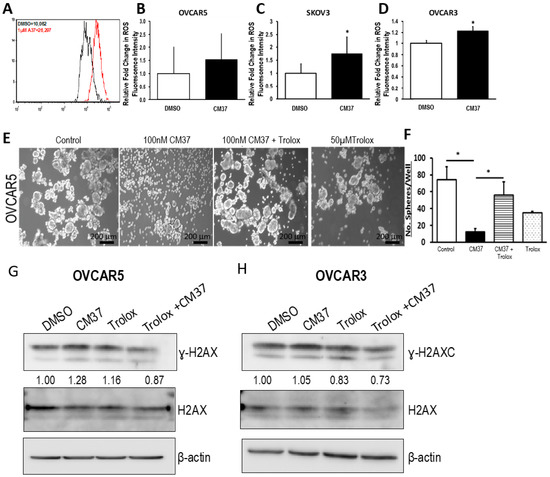 CM37 increases reactive oxygen species (ROS) levels in OC cells. (A) Representative flow cytometry for total intracellular ROS levels in OVCAR5 cells treated with DMSO or 1 µM CM37. (B–D) Fold change in ROS levels measured by flow cytometry in SKOV3, OVCAR3, and OVCAR5 treated with DSMO or 1 µM CM37 for 1 h. (E,F) Sphere formation in OVCAR5 cancer cells treated with 100 nM CM37 +/− 50 µM trolox for three days. Spheres were photographed under an inverted microscope (E) and counted (five fields per well; (F). Bars represent averages of triplicate measurements; * corresponds to p < 0.05. (G,H) Western blot measures γH2AX, H2AX, and β-actin protein levels in OVCAR5 and OVCAR3 cells cultured as spheres for six days and treated with 5 µM CM37 for 45 min, after 1 h or not of pre-treatment with Trolox (20 µM).
