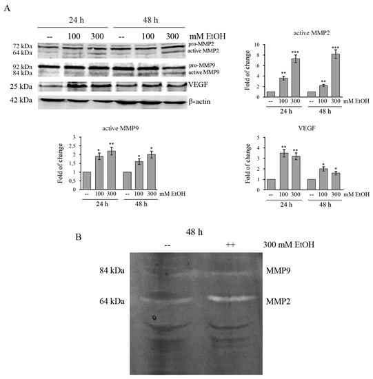 Given that metalloproteases (MMPs) are critical to cell invasion and metastasis [41], the expression and activity of MMP2 and MMP9 in EtOH-treated HCT116 cells were examined by both Western blotting analysis and gelatin zymography. Our results show that there is a significant increase in the protein level of active MMP2 (7-fold, p < 0.001) in HCT116 cells treated with 300 mM EtOH already after 24 h of treatment (Figure 6A). A minor increase (2.2-fold, p < 0.01) is observed for active MMP9 (Figure 6A). Moreover, gelatin zymography showed that 300 mM EtOH also increases the activity of both metalloproteinases (Figure 6B).