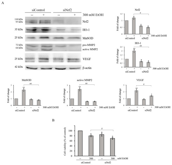 To further demonstrate the contribution of Nrf2 in protecting colon cancer cells by oxidative damage induced by EtOH, Nrf2 was downregulated by transfecting HCT116 cells with a specific siRNA pool directed against Nrf2. Western blotting analysis showed that the levels of Nrf2 protein in siNrf2-transfected group are significantly decreased (p < 0.05) after 24 h compared with the siRNA control group (Figure 7). Interestingly, the increases in HO-1 and MnSOD protein level caused by 300 mM EtOH treatment is suppressed by Nrf2 siRNA (Figure 7A), thus confirming that the expression of such antioxidant proteins is under Nrf2 control. Moreover, cell viability assay showed that Nrf2 silencing reduces HCT116 cell viability (Figure 7B), thus suggesting a protective role of Nrf2 axis against EtOH-mediated toxic effect.