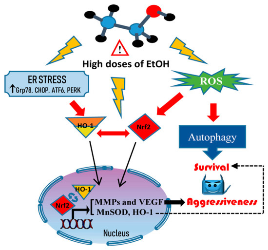 Scheme of the mechanism activated by high doses of ethanol. High doses of ethanol induce ROS generation and ER stress responsible for the induction of a prosurvival autophagic process and the aggressive tumor phenotype. Such events are sustained by the nuclear translocation of Nrf2 and HO-1, which activate antioxidant response systems and promote the upregulation of MMP2 and VEGF.
