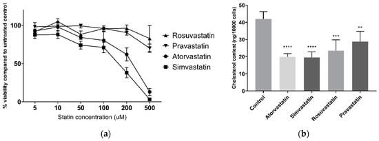 (a) HepG2 cell viability following 24 h statin treatment; (b) HepG2 cellular cholesterol following 24 h statin treatment. ** p < 0.01, *** p < 0.001, **** p < 0.0001 compared to control.