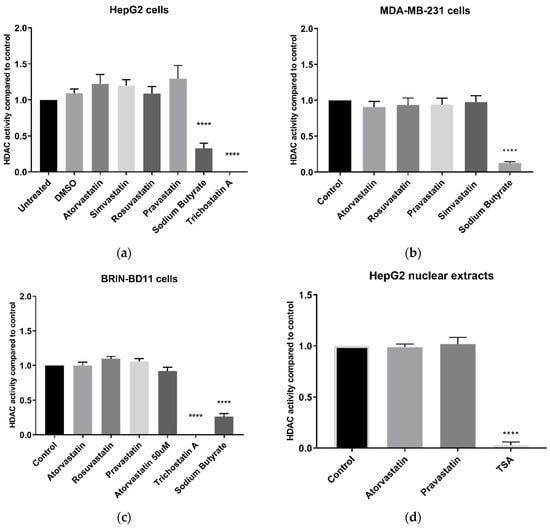 HDAC activity using the Sigma-Aldrich In Situ HDAC activity kit. (a) HDAC activity of live HepG2 cells following 24 h treatment with 10 µM statins; (b) HDAC activity of live MDA-MB-231 cells following 24 h treatment with 10 µM statins; (c) HDAC activity of live BRIN-BD11 cells following 24 h treatment with 10 µM statins; and (d) HDAC activity following direct application of 100 µM statins to HepG2 nuclear extracts. **** p < 0.0001 compared to control.