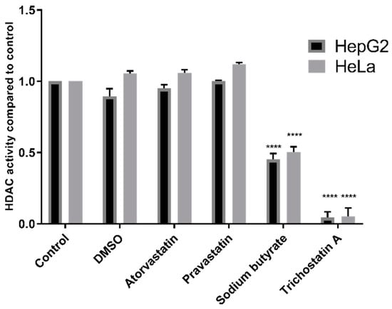 Additionally, experiments were conducted using the Fluor De Lys® HDAC fluorometric activity assay kit, also used in previous studies by Lin et al. [12], Chen et al. [13], and Singh et al. [11]. HDAC inhibition was observed with TSA (p < 0.0001) and sodium butyrate (p < 0.0001) but not with statins in either HepG2 nuclear extracts or in the HeLa cervical adenocarcinoma nuclear extract provided with the kit (Figure 3).