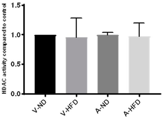 HDAC activity in nuclear extracts from livers of mice on a normal diet (ND) or high-fat diet (HFD) treated with atorvastatin (A) or water (V) for 12 weeks. n = 3 per group.