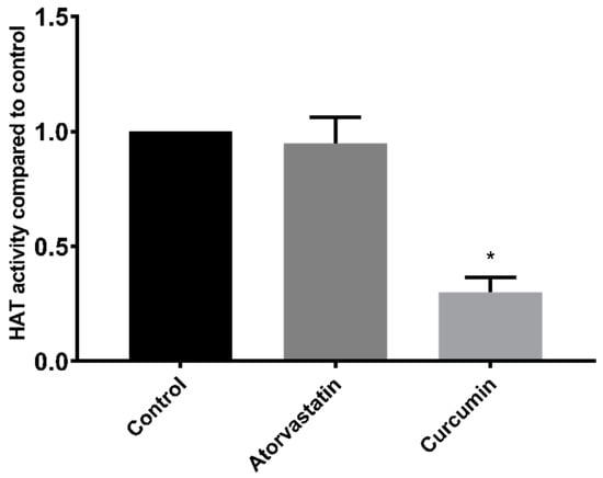HAT activity of HepG2 nuclear extracts treated with 100 µM atorvastatin or curcumin. * p < 0.05 compared to control.