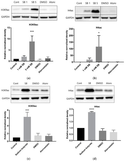 Baseline levels of histone H3K9 and H4 acetylation were low in HepG2 cells (Figure 6a,b). As expected, acetylation was increased in a dose-dependent manner by sodium butyrate treatment. Conversely, acetylation levels remained at a low baseline level in cells treated with atorvastatin. Similar results were seen in BRIN-BD11 cells (Figure S4). Baseline levels of histone acetylation were higher in THP-1 leukemic macrophages and were further increased by 5 mM sodium butyrate treatment, but atorvastatin had no effect (Figure 6c,d).