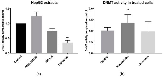 DNMT activity in HepG2 whole cell extracts. (a) DNMT activity in whole cell extracts treated directly with 200 µM atorvastatin, RG-108 or curcumin. (b) DNMT activity in whole cell extracts from cells treated for 24 h with 10 µM atorvastatin or curcumin. ** p < 0.01, *** p < 0.001