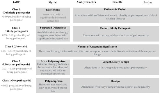 Variations of the five-tier system used to convey information about a variant in BRCA1. Classification recommended by the IARC Unclassified Genetic Variants Working Group (IARC) and endorsed by the Evidence-based Network for the Interpretation of Germline Mutant Alleles (ENIGMA) Consortium, and reported by select commercial testing companies in the U.S.