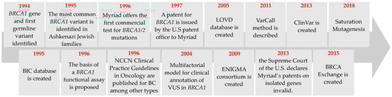 The first germline pathogenic variants in BRCA1 were identified in 1994 (Figure 2), when Miki et al. analyzed sequences from patients’ complementary DNA (cDNA) clones, hybrid-selected sequences, and amplified polymerase chain reaction (PCR) products [12]. The combination of these methods allowed the construction of a composite, full-length BRCA1 cDNA. The four variant alleles were an 11-base pair (bp) deletion in exon 2 (p.Cys24Serfs; c.69_79delGTGTCCCATCT), a nonsense variant in coding exon 11 (p.Gln1313Ter; c.3937C>T), a single nucleotide insertion in coding exon 20 (p.Gln1756Profs; c.5266dupC), and a missense variant in coding exon 21 (p.Metl775Arg; c.5324T>G). Since then, more than 10,000 unique germline variants have been detected in BRCA1 (BRCA Exchange; https://brcaexchange.org/) [13].