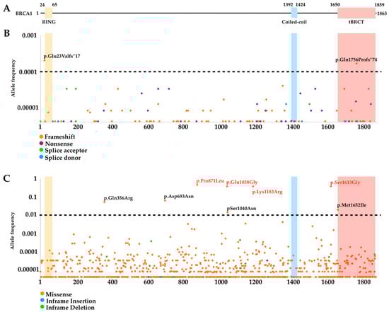 BRCA1 allele frequency. (A) Diagram of BRCA1 showing the RING-finger, coiled-coil and tandem (tBRCT) domains represented by the yellow, blue and pink backgrounds respectively. (B,C) Graphic representation of the allele frequency of BRCA1 (Ensembl transcript ENST00000357654.7) germline variants (HGVS nomenclature) deposited on the genome aggregation database (gnomAD) with data for individuals not selected for family or personal history of cancer [72] showing (B) frame shift (orange), nonsense (purple), splice acceptor (green) and donor (blue) variants; or (C) missense (orange), in frame insertion (blue) and deletion (green) variants.