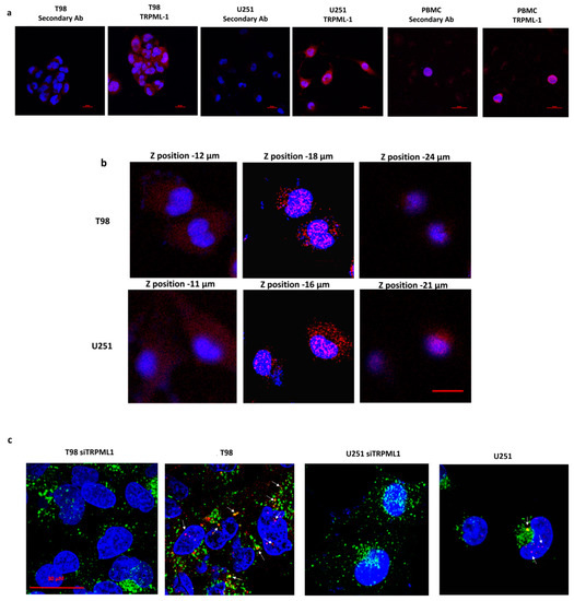 Immunocytochemistry results prompted us to examine the subcellular distribution of TRPML-1 in glioma cell lines by confocal laser scanning microscopy. As shown in Figure 2a, TRPML-1 localized mainly in the cytoplasm with a clustered pattern in PBMCs, while in T98 and U251 cell lines TRPML-1 was expressed as dot spots in the cytoplasmic and nuclear compartments (Figure 2a). Thanks to Z-axis analysis, we further demonstrated the TRPML-1 punctuate distribution in the nucleus of these cells and in perinuclear position (Figure 2b). Thus, to better appreciate the TRPML-1 protein localization, we performed a double staining using an Ab against human lysosomal-associated membrane protein (LAMP)-1, an endolysosomal marker. As shown in panel c, TRPML-1 can be localized to both nucleus and endolysosomes (Figure 2c). TRPML-1-silenced cell lines were used as negative control.