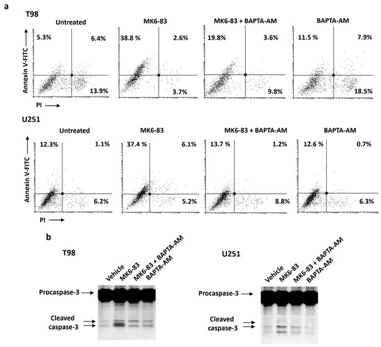 To examine the role of intracellular calcium in MK6-83-induced apoptosis, the effects of intracellular calcium chelator 1,2-Bis(2-aminophenoxy)ethane-N,N,N′,N′-tetraacetic acid tetrakis (acetoxymethyl ester) (BAPTA-AM) on cell death and cleavage of caspase-3 were studied. Glioma cells were pretreated with BAPTA-AM (10 μM) for 2 h before exposure to MK6-83 for up to 72 h. After 24 h of cotreatment, BAPTA-AM significantly reduced MK6-83-induced apoptotic cell death, as evaluated by Annexin V/PI staining. In both cell lines, there is about 50% of Annexin V-positive cells reduction in cotreated with respect to MK6-83-alone-treated cells (Figure 5a). Moreover, via immunoblot, we demonstrated that the cotreatment with BAPTA-AM in T98 after 24 h and in U251 after 72 h attenuates the MK6-83-induced caspase-3 cleavage compared to MK6-83-treated cells (Figure 5b). Since BAPTA-AM alone did not interfere with apoptosis, our data indicate that intracellular Ca2+ is involved in the MK6-83-induced apoptotic processes in glioma cells.
