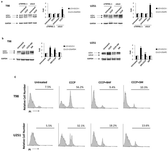 To further investigate the role of TRPML-1 in CCCP-induced autophagy, TRPML-1-silenced glioma cells were treated with CCCP for 48 h. As shown in Figure 7a, while in siGLO control cells, CCCP increased the conversion of LC3-I in LC3-II, while in the siTRPML-1 cells it was not able to (Figure 7a). Moreover, we also evaluated the effects of the TRPML-1 inhibitor, sphingomyelin (SM) [21]. The pretreatment with 20 μM SM for 1 h inhibited CCCP-induced autophagy in both T98 and U251 cell lines, suggesting that the CCCP-induced autophagy is TRPML-1 mediated (Figure 7b). SM alone did not influence LC3 conversion (Figure 7b).