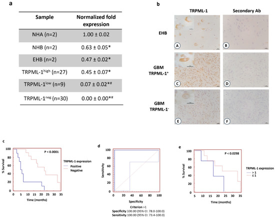 TRPML-1 expression was also analyzed at protein levels by immunohistochemistry. Similar to qRT-PCR analysis, TRPML-1 immunoreactivity was evidenced in 36 GBM patients and in EHB tissues, used as positive control. In EHB samples, only neurons developed immunoreaction at the level of the cytoplasm with perinuclear localization (Figure 8b). In GBM tissues, cells develop immunoreaction with a different degree of intensity (Figure 8b). No reactivity was present in tissue sections incubated with the omission of the primary Ab.