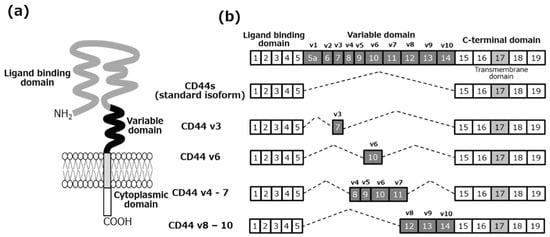 CD44 and CD44 splice variants. (a) CD44 is a transmembrane glycoprotein. CD44 consists of the extracellular domain, the transmembrane domain, and the cytoplasmic domain. The ligand binding/extracellular domain interacts with hyaluronic acid, osteopontin, chondroitin, collagen, and fibronectin. The CD44 cytoplasmic domain mediates transcription. (b) The CD44 gene consists of 20 exons. CD44 gene, exons 1–5 and 16–20 produce the standard isoform of CD44, referred to as the CD44 standard (CD44s). The remaining exons 6–15 are alternatively spliced and assembled with the ten exons contained in the CD44 standard isoform and are referred to as the CD44 variant isoforms (CD44v).