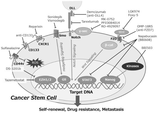 Several approaches have been adopted to target the surface markers of CSCs, and the signal transduction pathways involved in CSCs, such as Wnt, Hedgehog, Notch, and STAT3. For example, sulfasalazine (SSZ), an inhibitor of xCT in the CD44v-positive CSCs, combined with cisplatin and anti-CD44 antibodies, have been effective in gastric cancer, lung cancer, and acute myeloid leukemia due to the reduced intracellular glutathione (GSH) levels and inducing terminal differentiation of CSCs [,,]. The treatment with an antibody against another CSC marker, CD133, proved highly effective for eliminating several type of grafted tumors in vivo [], and the bi-specific antibodies initiating T cell responses and immunotoxin against CD133 have recently been developed []. Chemokine receptor 1 (CXCR1), a receptor for CXC ligand 8 (CXCL8), which is a proinflammatory chemokine, is one of the actionable receptors expressed in breast cancer stem cells. The inhibitor of CXCR1/2, reparixin, has been effective in human breast cancer xenografts, and a phase Ib clinical trial has been completed in patients with metastatic breast cancer [].