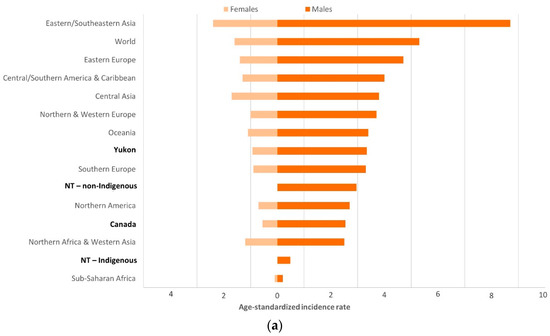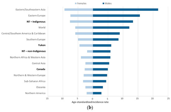 (a) Estimated cardia gastric cancer age-standardized incidence rates (ASRs per 100,000) by population and sex; (b) Estimated non-cardia gastric cancer ASRs (per 100,000) by population and sex; northern territories, Canada, and world regions, various years. Age-standardized incidence rates (ASRs) standardized to the World Population. Canada and Yukon include cases diagnosed during 2003–2007; Northwest Territories (NT) includes cases diagnosed during 1997–2015. World and regional cardia and non-cardia gastric cancer ASR estimates from Colquhoun, et al. (2014) [2].