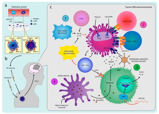 The generation of DC vaccines and the complex interplay of DC vaccines within the GBM tumor microenvironment (a): Peripherally isolated DCs or monocyte-derived DCs are pulsed with the antigen of choice with the addition of adjuvant maturation cocktails ex vivo to generate DCVs (b): DC vaccines are then administered subcutaneously or intramuscularly with the option of simultaneous injection of toxoid (Td), an adjuvant that enhances the trafficking of DC vaccines to the GBM tumor microenvironment via CCL3; (c): Primed DCs traffic to the tumor microenvironment where they must overcome the immunosuppressive effects of tumor-associated macrophages and microglia (c1) to effectively generate anti-tumor CD4+ and CD8+ T cells responses through the presentation of tumor-associated or tumor-specific antigens and expression of co-stimulatory molecules (c2). In addition to pro-tumor myeloid populations, glioma tumor cells also secrete various inhibitory molecules aimed at blunting the functionality of DCs (c3). Adjuvants targeting the tumor cells directly through mIR-326 or indirectly via NANO-DOX particles delivered by DCs have been used to enhance the anti-tumor effects of DCVs (c4).