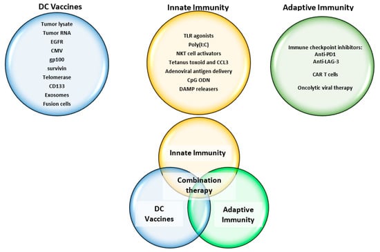 - Bregy, A.; Wong, T.M.; Shah, A.H.; Goldberg, J.M.; Komotar, R.J. Active immunotherapy using dendritic cells in the treatment of glioblastoma multiforme. Cancer Treat. Rev. 2013, 39, 891–907. [Google Scholar] [CrossRef] [PubMed]