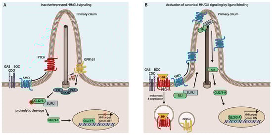 In vertebrates, HH/GLI signaling is coordinated within the primary cilium and involves a highly complex regulatory relay mechanism with numerous effectors and modifiers (for extensive reviews, see References [10,11,12,13,14,15,16,17,18,19]). Notably, in the absence of ligand, the pathway is actively repressed by the unliganded form of the twelve-transmembrane domain receptor Patched (PTCH1), thereby preventing the activation and ciliary entry of the essential pathway effector Smoothened (SMO), a seven-transmembrane protein with similarities to G protein-coupled receptors [20,21] (Figure 1A). Intriguingly, the repressive activity of PTCH1 and its negative impact on SMO activation involves PTCH1-mediated reduction of cholesterol availability in the inner leaflet of the cell membrane [22].