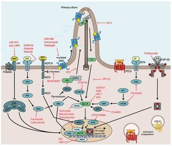 Apart from a number of post-translational modifications in response to the oncogenic cues outlined above, cell-intrinsic signal crosstalk and integration of HH/GLI with other cancer pathways also contribute to SMO-independent GLI regulation. Our own studies have shown that the epidermal growth factor (EGFR) pathway cooperates with HH/GLI in oncogenic transformation via activation of the RAS/RAF/MEK/ERK/JUN axis, where synergy is mediated via cooperative activation of HH–EGFR target gene promoters, a mechanism that involves selective and simultaneous promoter binding of GLI and JUN transcription factors [96,115,116]. Similarly, pro-inflammatory signals such as IL6 can cooperate with HH/GLI in promoting cancer growth via a molecular mechanism where GLI and the IL6/JAK2-activated transcription factor STAT3 bind and synergistically activate common HH-IL6 target genes [117]. In line with an important role of EGFR and IL6 signaling in GLI-driven cancers, genetic and pharmacological inhibition of EGFR and IL6/JAK2/STAT3 signaling, respectively, interferes with GLI-driven tumor growth [116,117].