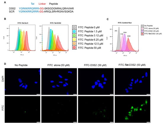 Figure 3B). To serve as a control for cellular uptake rather than non-specific membrane binding, we performed a similar experiment where fluorescence of cells was measured after incubation with 50 µM FITC alone, 50 µM FITC-D3S2 peptide without the Tat-leader sequence or 50 µM FITC-Tat-D3S2. Although some uptake of control compounds was observed, addition of the Tat sequence increased uptake by almost four-fold relative to the FITC-labeled D3S2 peptide and almost eight-fold relative to FITC alone (