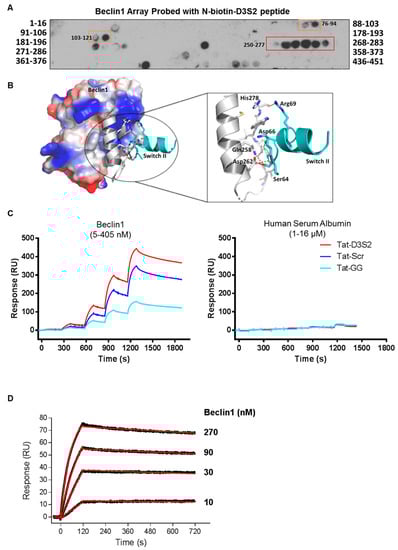 Binding of the D3S2 peptide to Beclin1 was established using a Beclin1 peptide array (16mers stepped by three amino acids). Using biotinylated-D3S2, we determined that the peptide showed significant activity with amino acids 250–277 (