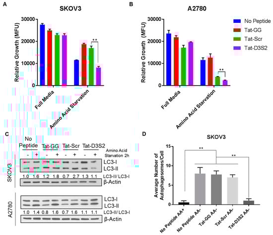 Figure 5A,B). The inhibition of cell viability was correlated to the binding affinity of the peptides to Beclin1, and showed specificity to those cells undergoing autophagy as the cells cultured with the peptides in complete media did not show significant growth inhibition. To determine if the effect on cell viability was specifically due to blocking DIRAS3-mediated autophagy upon amino acid deprivation, both cell lines were pre-treated with 50 µM peptides Tat-GG and Tat-Scr serving as controls, and Tat-D3S2 for 2 h prior to changing the media to one lacking amino acids and re-treating the cells for 2 h. Cell lysates were collected, and Western blot analysis was performed documenting a significant induction in autophagy following amino acid deprivation in untreated cells, and those treated with 50 µM of Tat-GG or Tat-Scr peptide. Tat-D3S2 treatment decreased the induction of autophagy for both cell lines as determined in a decreased LC3I/LC3II conversion ratio (