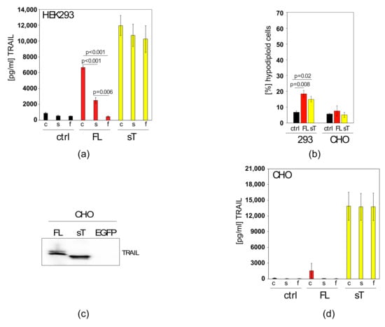 Figure 2. In apoptosis-sensitive, FL-TRAIL expressing cells, TRAIL appears in the supernatant owing to apoptosis, but not secretion (a) HEK293 cells were transfected with an empty plasmid (ctrl), a FL-TRAIL construct (FL) or an sTRAIL (sT) construct. The resulting medium supernatants were either taken as crude supernatants (c), centrifuged (s) or filtered through a 0.45 μm filter (f) before TRAIL levels were measured by ELISA (b) Apoptosis was measured in HEK293 and CHO cells that were transfected with an empty plasmid (ctrl), an FL-TRAIL construct (FL) or an sTRAIL construct (sT). (c) CHO cells were transfected with pCDNA3 constructs expressing FL-TRAIL (FL), sTRAIL (sT) or EGFP. The resulting protein lysates were subjected to western blotting. The membrane was then probed with a TRAIL antibody. (d) CHO cells were transfected with an empty plasmid (ctrl), a FL-TRAIL construct (FL) or an sTRAIL (sT) construct. The resulting medium supernatants were either taken as crude supernatants (c), centrifuged (s) or filtered through a 0.45 μm filter (f) before TRAIL levels were measured by ELISA. Values represent mean ± SE.