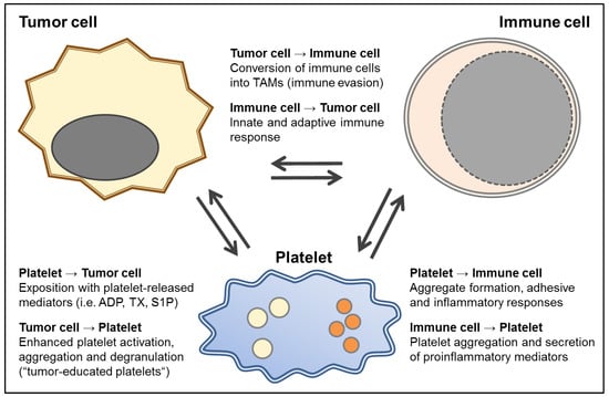 A scheme of the multiple and mutual interactions between tumor and immune cells and platelets. Platelets and tumor cells interact at various levels. Platelet-derived paracrine mediators such as adenosine diphosphate (ADP) as well as lipid signaling mediators like thromboxane (TX) and sphingosine-1-phosphate (S1P) are secreted upon platelet activation and can modulate tumor cell activity []. Tumor cells can in turn enhance platelet reactivity and educate platelets to release tumorigenic and angiogenic mediators and stimulate thrombopoiesis [,]. While the platelet itself can be seen as an immune cell, it can also interact in multiple ways with the different nucleated immune cells [,]. For example, platelet derived mediators such as S1P enhance monocyte activity levels via upregulation of the protease-activated thrombin receptors (PARs)-1 and -4 resulting in enhanced chemotactic capacity and amplifying cyclooxygenase-2 (COX-2) expression [,]. In turn, immune cells, such as monocytes, can also release tissue factor-rich microparticles to enhance fibrin formation, enhance clot stability, and ultimately thrombosis []. Activated immune cells such as microglia and also peripheral monocytes enter the tumor tissue []. In the case of the GBM, this results in the conversion of the infiltrating immune cells into immunosuppressive tumor-associated macrophage (TAMs), which are modulated to protect the tumor. Therapeutic approaches to target these immunosuppressive defense mechanisms are currently under discussion [,].
