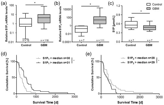 Expression of S1P receptors and circulating peripheral S1P levels are altered in GBM patients. In previous studies, we observed highly upregulated levels of mRNA for the S1P receptors S1P1 (a) andS1P2 (b) in GBM tissue []. The expression levels of both S1P receptors significantly correlated with the survival time of the respective GBM patients (d,e). In a later study, our data indicated reduced levels of S1P in platelet-rich plasma of GBM patients (c) []. These observations point towards a key role of S1P signaling system in the pathophysiology of GBM and are in agreement with studies from other groups [,]. Data are adapted from Bien-Möller et al. [] and Marx et al. [] and are shown as box plots representing the median as horizontal bars as well as the 5th and 95th percentile. * p < 0.05, Mann Whitney U test.