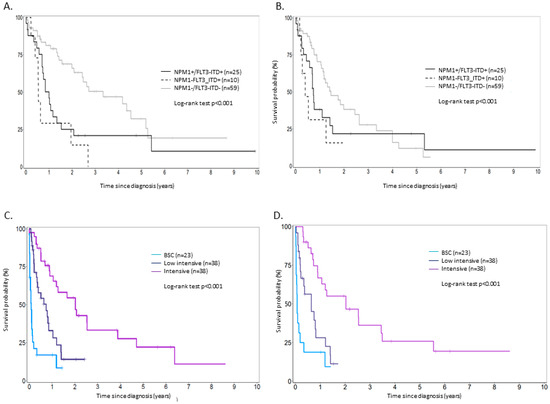 When focusing on normal karyotypes, NPM1+FLT3-ITD− cases treated intensively had a higher CRc rate and a better outcome in terms of OS and PFS than all other patients with normal karyotype. In the intermediate-risk group, intensive chemotherapy was superior to low intensity therapy in NPM1+FLT3-ITD+ (median OS: 10.1 vs. 2.9 months, p < 0.001) and NPM1−FLT3-ITD− (17.4 vs. 13.4 months, p < 0.001). In NPM1−FLT3-ITD+ patients, there was no difference in terms of OS regardless of the treatment strategy was (median OS: 7.56 (intensive) vs. 8.15 (low intensity) vs. 1.15 months (BSC), respectively, p = 0.2).