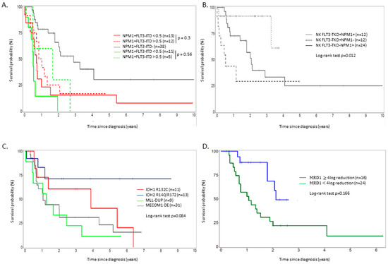 (A) Overall survival in NK patients according to their NPM1/FLT3-ITD status, (B) overall survival in FLT3-ITD− patients according to NPM1 and FLT3-TKD status, (C) overall survival in patients with IDH1 R132, IDH2 R140Q/R172K, MLL-DUP mutations and MECOM1 overexpression, independently of the karyotype, (D) overall survival in NPM1 mutated patients according to NPM1 MRD1 log reduction (all patients were treated intensively).