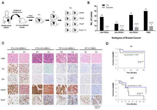 PDX models had been known to be one of the good tools mimicking biological characteristics of cancers [22]. These sustain histological characteristics and functions after mice passages. However, it is relatively difficult to engraft the tumors in the immunodeficient mice and it takes time to develop a successful PDX model, which usually takes 4–8 months to go through a few generations [23]. Those are big obstacles in developing a personalized treatment strategy for each patient. PDX engraftment success rates in previous studies have been shown to vary, ranging from approximately 15% to 30% [10,23,24]. The tumor tissue factors that affect successful engraftment are still not well known. However, it has been shown that aggressive tumor characteristics are associated with engraftment success. One of the factors indicative of tumor aggressiveness is breast cancer tissue subtype. Previous reports have shown relatively high success rates for HER2-positive and TNBC types, and low success rates for the HR-positive subtype [10,23,24]. In the present study, the success rate of PDX establishment according to subtype was 21.9% for HR−/HER2+, 22.5% for TNBC, and 3.6% for HR+/HER2−, results compatible with previous reports [10,23,24,25,26]. Another aggressive tumor feature is chemotherapy resistance. In the samples derived from chemotherapy-resistant tumors, the PDX success rate was relatively high compared with that in samples lacking chemotherapy resistance, indicating that resistance to treatment can also affect PDX success rate. Other factors affecting success rate may be tumor microenvironment and mouse strain. Co-introduction of an immortalized human fibroblast and mesenchymal stem cell were explored to improve PDX success rate [27,28]. Various mouse strains with different immunosuppression can also affect the outcome [29]. No specific methods have been established, thus further studies are required for enhancing the clinical utility of PDX models.