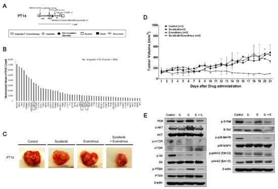 In vivo efficacy of sorafenib and everolimus against PDX models from PT14 (TNBC subtype). (A) PT14 treatment history. See text for details. Scale bar, one year. (B) Gene expression analysis using Nanostring nCounter GX human cancer reference kit in the PDX model (F1) from PT14. Expression data were analyzed using the nSolver analysis module. Expression values (nCounts) were normalized to six internal reference genes. The top upregulated 52 genes with counts >500 were selected among the 230 human cancer-related genes. (C) Images of PDX model tumors from PT14 following treatment with sorafenib and everolimus, alone and in combination. (D) Tumor volumes (F3) were determined in female mice (n = 2–3) treated with sorafenib (●, 120 mg/kg), everolimus (▲, 20 mg/kg), or their combination (★), administered once daily for three weeks by oral gavage; mice administered saline (■) served as controls. Tumor volumes at 21 days are presented as means ± SD (p < 0.05 for control vs. sorafenib + everolimus; unpaired t-test). (E) Expression of PI3K, p-AKT, AKT, p-mTOR, mTOR, p-S6, S6, p-PTEN, PTEN, p-B-Raf, B-Raf, p-p38 MAPK, p38 MAPK, p-p44/42, p44/42, and β-actin proteins in PDX tumors from PT14 treated with sorafenib, everolimus, and their combination. S.; sorafenib, E.; everolimus, S. + E.; sorafenib + everolimus.