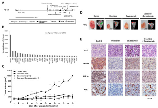 PT12 (F/35), diagnosed with TNBC (pT2N0), received breast-conserving surgery, adjuvant chemotherapy, and radiation therapy. One year later, local recurrence was detected. Although multiple chemotherapies were administered, including paclitaxel, vinorelbine with cisplatin, gemcitabine with cisplatin, capecitabine and eribulin, the disease progressed and metastasized (Figure 3A). To further test the antitumor effects of combined treatment with sorafenib and everolimus in the TNBC subtype, we treated the PT12 PDX model with sorafenib and everolimus, alone and in combination (Figure S2). Each treatment regimen tended to diminish the growth of PDX tumors derived from PT12; although the trend was stronger for single treatment, none of these treatments caused a significant effect (p > 0.2 for control vs. sorafenib, everolimus and sorafenib + everolimus) (Figure S2A,B). Treatment with sorafenib or the combination of sorafenib with everolimus resulted in no significant differences in the detected expression levels of Ki-67, VEGFA, or HIF1A between control and drug-treated tumors (Figure S2C). To explore potentially more effective treatments specific to PT12, we analyzed gene expression patterns for PT12 PDX tumors using the Nanostring PanCancer Pathway panel (Figure 3B). This analysis revealed that VEGFA was among the most highly expressed genes (nCounts > 2000) (Figure 3B). On the basis of previous studies that have targeted VEGFA in breast cancer [14,15,16,17], we tested the tumor-suppressive effects of bevacizumab, a humanized Vascular Endothelial Growth Factor A (VEGFA) antagonist and docetaxel, which was chosen with the consideration of treatment history on PDX models derived from PT12 (Figure 3). The combination of bevacizumab and docetaxel were widely used in metastatic breast cancer treatment [18]. Treatment with docetaxel or bevacizumab individually for 28 days significantly decreased volumes of PDX model tumors from PT12; drug treatment was well tolerated as indicated by the lack of significant body weight loss (p ≤ 0.05 for control vs. docetaxel and control vs. bevacizumab) (Figure 3C,D and Figure S1B). However, combination therapy with bevacizumab and docetaxel did not exert synergistic tumor growth inhibition effects compared with single drug treatment (control vs. docetaxel + bevacizumab, p = 0.06). The number of proliferating (i.e., Ki-67-expressing) cells was reduced in bevacizumab, docetaxel, and the combination treatment groups compared with the control group (Figure 3E). Treatment with bevacizumab, docetaxel, or their combination also suppressed the expression of VEGFA and HIF1A, factors upstream of VEGFA in hypoxia signaling, particularly treatment with docetaxel (Figure 3E). These results support the conclusion that targeting of VEGF would be an effective therapeutic strategy for TNBC patient PT12.