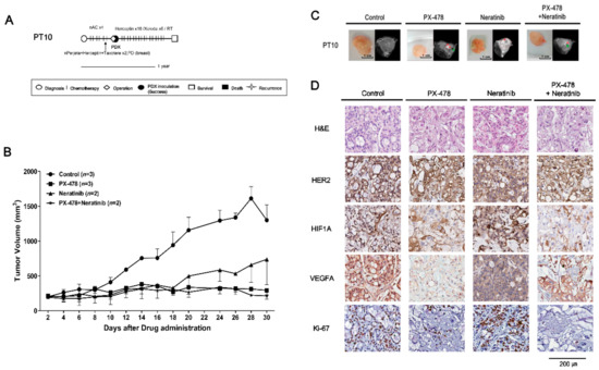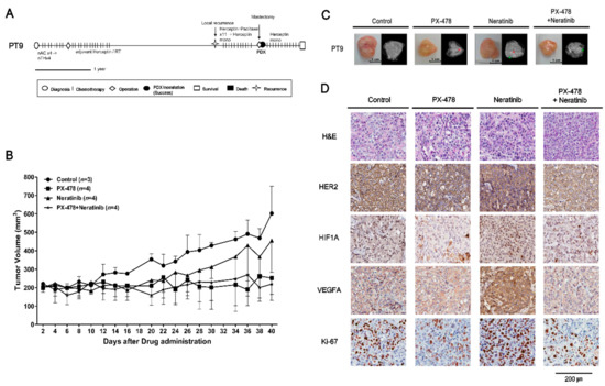 To optimize the therapeutic strategies for trastuzumab-exposed HR−/HER2+ breast cancer patients, we established PDX models from HR−/HER2+ tumors from PT9 and PT10. We performed a multiplex gene expression analysis using the Nanostring nCounter GX Human Cancer Reference kit for PT5 with a HR−/HER2+ subtype, which revealed high expression of HIF1A and HER2/ERBB2 (nCounts >500) (Figure S3A). Initially, the PDX model from PT5 was used to detect the potential drug targets, and test the tumor growth inhibitory effects of PX-478 (S-2-amino-3-(4′-N,N,-bis(chloroethyl)amino) phenyl propionic acid N-oxide dihydrochloride), a small molecule that selectively inhibits hypoxia-induced HIF1A mRNA expression and translation [19,20,21], and neratinib on this HR-/HER2+ subtype. PX-478 and the combination of PX-478 with neratinib significantly inhibited tumor growth compared with control and neratinib treatment groups (Figure S3B). Immunohistochemical data showed that the expression level of HIF1A was also highly increased in PT9 and PT10 PDX models (Figure 4 and Figure 5D). On the basis of these results, we tested PX-478 (10 mg/kg), neratinib (20 mg/kg), and their combination in PT9 and PT10 PDX models (Figure 4 and Figure 5). Notably, PX-478 alone and the combination of PX-478 with neratinib showed significant tumor growth inhibition (p < 0.05) in both two trastuzumab-exposed HR−/HER2+ PDX models compared with controls (Figure 4 and Figure 5B,C). However, treatment with neratinib alone did not cause significant tumor growth inhibition (p = 0.28). Treatment of PDX tumor-bearing mice with these drugs caused less than a 15% reduction in body weight (Figure S1C,D), suggesting minimal toxicity. An immunohistochemical analysis suggested that PX-478 alone or in combination with neratinib more reduced Ki-67 expression than that of control or neratinib treated groups (Figure 4 and Figure 5D). HER2 expression level was not different between neratinib treatment groups and other drug treatment groups (Figure 4 and Figure 5D). HIF1A expression was attenuated by PX-478 alone and combined treatment with PX-478 and neratinib, whereas it was unaffected by treatment with neratinib alone (Figure 4 and Figure 5D). VEGFA expression, a downstream target of HIF1A, was only reduced by treatment with PX-478 alone and combination treatment groups in PT10 PDX model (Figure 4 and Figure 5D). These data suggest that inhibition of HIF1A is an alternative therapeutic strategy for trastuzumab-exposed HR−/HER2+ breast cancer tumors.