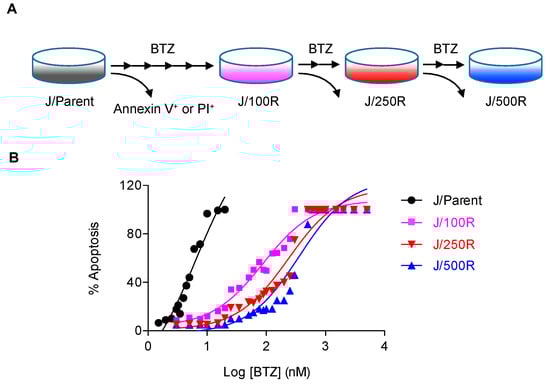 Resistant phenotype of de novo bortezomib (BTZ)-resistant mantle cell lymphoma (MCL) cells in comparison to parental MCL cells. (A) Schematic diagram for the establishment of BTZ-resistant MCL cells from parental (J/Parent) cells by stepwise selection method. (B) J/Parent cells and BTZ-resistant cells at different degrees (J/100R, J/250R and J/500R) were treated with various concentrations of BTZ (0–5000 nM) and apoptosis was determined by Hoechst 33342 at 24 h. Dose-response curves were generated on a logarithmic scale of drug concentration as opposed to a linear scale of percentage of apoptosis. Lethal concentration 50 (LC50) of BTZ in parental and resistant cells were then calculated from the plot and compared.