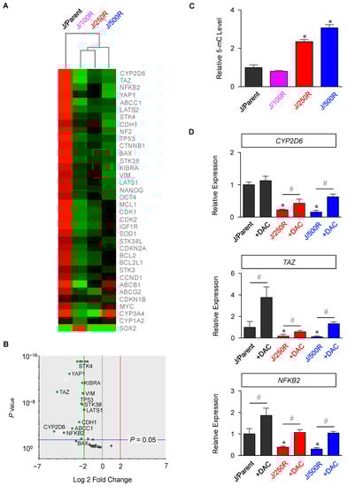 Analysis of mRNA expression of putative cancer-related genes involved in drug resistance and cell survival of MCL by quantitative real-time PCR. (A) Data from three independent experiments were normalized to house-keeping GAPDH, averaged and represented in heatmap in the three-color scale of red (upper), black (midpoint) and green (lower). (B) Volcano plot of differentially expressed genes comparing J/Parent and J/500R cells with fold change >2 and p < 0.05; two-sided Student’s t-test. (C) Global DNA methylation was evaluated by measurement of 5-methylcytosine (5-mC). Relative absorbance (OD450) of samples to parental cells are shown. Data are mean ± SD (n = 3). * p < 0.05 versus J/Parent cells; two-sided Student’s t-test. (D) J/Parent, J/250R and J/500R cells were sequentially treated with 5-aza-2′-deoxycytidine (DAC) (1 μM) for 72 h and mRNA expression of CYP2D6, TAZ and NFKB2 were evaluated by quantitative real-time PCR. Data are mean ± SD (n = 3). * p < 0.05 versus J/Parent cells; two-sided Student’s t-test. # p < 0.05 versus non-treated cells; two-sided Student’s t-test.