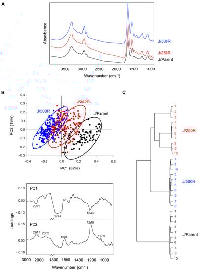FTIR spectroscopy is a sensitive technique capable of providing significant information on the biochemical content of cellular macromolecules, such as proteins, lipids, nucleic acids and carbohydrates, that could be linked to cellular organization and physiological state of the cells [24,25]. Figure 3A shows the mean FTIR spectra of the parental J/Parent cells and BTZ-resistant J/250R and J/500R cells recorded from more than 200 single cells in the mid-IR region of 4000 to 800 cm−1. Principle component analysis (PCA) is one of the most common multivariate techniques that concentrates the source of variability in the data into few PCs. The PCA of spectroscopic data provide two types of information: (i) visualization of clustering of similar spectra within datasets in scatter plots; and (ii) identification of variables (spectral bands representing various molecular groups within the samples) in loading plots. Figure 3B (top) shows the scatter plot of PC1 (PC score; 52%) against PC2 (19%) that could separate the parental cells from BTZ-resistant cells. In brief, J/Parent cells clustered in the positive direction of PC1, while BTZ-resistant cells, particularly J/500R cells, were mostly in the negative direction of PC1 in correlation with the spectral region centered at 2921 (C–H total lipid), 1747 (C=O ester lipid) and 1243 (nucleic acid) cm−1 (Figure 3B, bottom). For J/250R cells and J/500R cells, the separation along PC2 can also be explained by the positive loading for PC2 in the spectral region centered at 2917 and 2850 (C–H lipid), 1633 (β-sheet amide I), 1240 (nucleic acid) and 1078 (glycoprotein and carbohydrate region) cm−1. Hierarchical cluster analysis for the spectral regions from 3000–2800 cm−1 to 1750–800 cm−1 was performed as a second method to classify and determine the similarity of FTIR spectra of J/Parent, J/250R and J/500R cells. Figure 3C shows that the FTIR spectra of J/250 and J/500R cells harbored significant similarities (first group) whereas the J/Parent cells were clustered separately as a second group, indicating that FTIR spectral signatures could clearly distinguish BTZ-resistant cells from the parental cells.