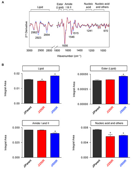 Spectral assignments and quantification of biochemical contents in parental and BTZ-resistant cells using integral area. (A) The second derivative spectra obtained from the mean FTIR spectra of the parental J/Parent cells and BTZ-resistant J/250R and J/500R cells in the wavelength range of 3000–2800 cm−1 to 1750–800 cm−1. Band assignments for the regions of lipid, ester (lipid), amide I, amide II, nucleic acid (DNA/RNA) and nucleic acid, glycoprotein and other carbohydrate (nucleic acid and others) were illustrated. (B) Integral area of total lipid, ester (lipid), combined amide I and II and nucleic acid and others, with observed changes, were plotted. Data are mean ± SD (n = 3). * p < 0.05 versus J/Parent cells; two-sided Student’s t-test.