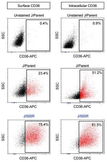 We assessed the gene expression of markers of de novo fatty acid synthesis (FASN) and thyroid hormone responsive spot 14 (THRSP) and exogenous fatty acid uptake CD36 [30,31] and observed a dramatic upregulation of CD36 with subtle changes in FASN and THRSP in J/500R cells when compared to parental cells (Figure 5C). Hence, we postulated that an increase in lipids in BTZ-resistant J/500R cells was likely mediated by an increase in exogenous uptake via CD36 receptor. Flow cytometric analysis further revealed an increase in CD36 protein expression on both cell surface and intracellular compartment of J/500R cells when compared to parental cells (Figure 6).
