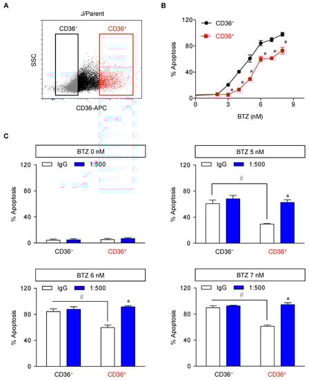CD36+ cells were less susceptible to BTZ-induced apoptosis. Parental (J/Parent) cells were isolated based on CD36 expression into CD36− and CD36+ cells using fluorescence-activated cell sorter (FACS) (A) and apoptosis in response to BTZ (0–8 nM) were determined by Hoechst 33342 assay at 24 h (B). Data are mean ± SD (n = 3). * p < 0.05 versus CD36− cells; two-sided Student’s t-test. (C) CD36+ cells were pretreated with neutralizing antibody (1:500) for 1 h and treated with BTZ (0–7 nM) for 24 h. After which, apoptosis was determined by Hoechst 33342 assay. Data are mean ± SD (n = 3). * p < 0.05 versus BTZ-treated IgG control CD36− or CD36+ cells; two-sided Student’s t-test. # p < 0.05 versus CD36− control; two-sided Student’s t-test.