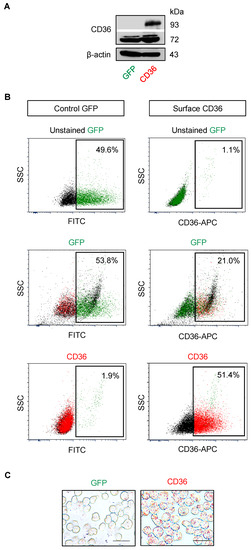 Overexpression of CD36 caused an accumulation of lipid content. Parental (J/Parent) cells were transfected with CD36 or green fluorescence protein (GFP) control plasmid using nucleofection. (A) Transfected cells were analyzed for total CD36 level using Western blotting. (B) Flow cytometry analysis of surface CD36 (right) and GFP for transfection control (left). Percentage of CD36- and GFP-positive cells (box) were determined based on their internal negative control (unstained cells). (C) Analysis of lipid droplets by oil red O staining. Scale bar = 50 µm.