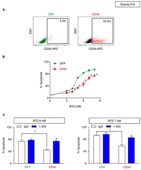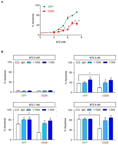 CD36 is a key mediator of BTZ-induced apoptosis. (A) Parental (J/Parent) cells were transfected with CD36 or GFP control plasmid using nucleofection and apoptosis in response to BTZ (0–8 nM) was determined by Hoechst 33342 assay at 24 h. Data are mean ± SD (n = 4). * p < 0.05 versus GFP control; two-sided Student’s t-test. (B) CD36-overexpressing Jeko-1 cells were pretreated with neutralizing antibody (1:1000–500) for 1 h and treated with BTZ (0–8 nM) for 24 h. After which, apoptosis was determined by Hoechst 33342 assay. Data are mean ± SD (n = 3). * p < 0.05 versus BTZ-treated IgG control GFP or CD36-overexpressing cells; two-sided Student’s t-test. # p < 0.05 versus GFP control; two-sided Student’s t-test.