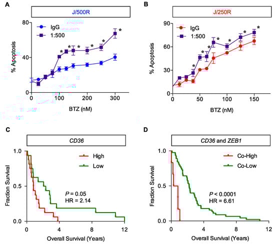 Inhibition of CD36 enhances BTZ sensitivity in BTZ-resistant cells. BTZ-resistant J/500R cells (A) or J/250R cells (B) were treated with BTZ (0–300 or 0–150 nM) in the presence or absence of CD36 neutralizing antibody (1:500) and apoptosis was determined by Hoechst 33342 assay at 24 h. Data are mean ± SD (n = 4). * p < 0.05 versus IgG control; two-sided Student’s t-test. (C) Kaplan Meier survival plot of MCL patients from the gene microarrays (GSE10793) according to the level of CD36 expression. Overall survival of patients with highest expression (cutoff: Upper quartile, red line) is compared to patients with lowest expression (cutoff: Lower quartile, green line) (n = 32). (D) Kaplan Meier survival plot of MCL patients (GSE10793) according to the level of CD36 and ZEB1 co-expression. Overall survival of patients with highest co-expression (cutoff: Upper quartile, red line) is compared to patients with lower co-expression (green line) (n = 54).